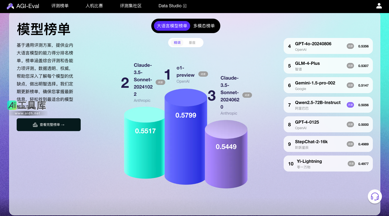 AGI-Eval的核心是其全面的评测榜单,包括大语言模型榜单和多模态榜单。这些榜单基于一套通用且经过验证的评测方案,对业内流行的大语言模型进行综合评分和各项能力评分,定期更新数据,确保用户获取的是最新最准确的信息。例如,榜单中列举了诸如OpenAI、Anthropic、Google等公司的大语言模型,并提供每一个模型的详细能力得分,使用户可以根据自身需求选择最合适的AI解决方案。