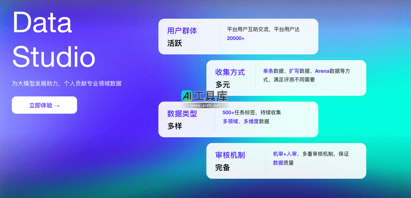AGI-Eval旗下的Data Studio为模型发展提供有力支持。通过多种数据收集方式和多维度的数据类型,Data Studio帮助用户更好地构建和调试模型。同时,平台拥有完备的审核机制,以机器审核和人工审核结合的方式保证数据质量。借助Data Studio,用户不仅可以贡献自身的专业领域数据,还可以与超过两万的活跃平台用户交流分享经验,推动AI领域发展。
