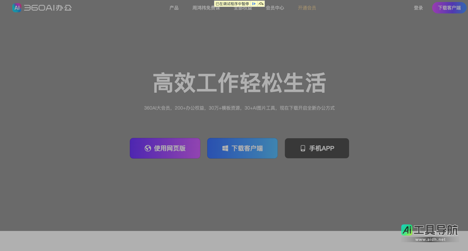 随着人工智能技术的飞速发展,AI在办公领域的应用越来越广泛,成为提升工作效率的重要工具之一。360AI办公作为360公司推出的一款一站式AI办公工具集,集成了丰富的AI功能,涵盖了AI图片处理、AI文档编辑、AI写作、AI音视频处理、自动生成PPT、PDF工具等200多项办公权益,提供了超过30万的模板资源,旨在帮助用户高效工作,轻松生活。