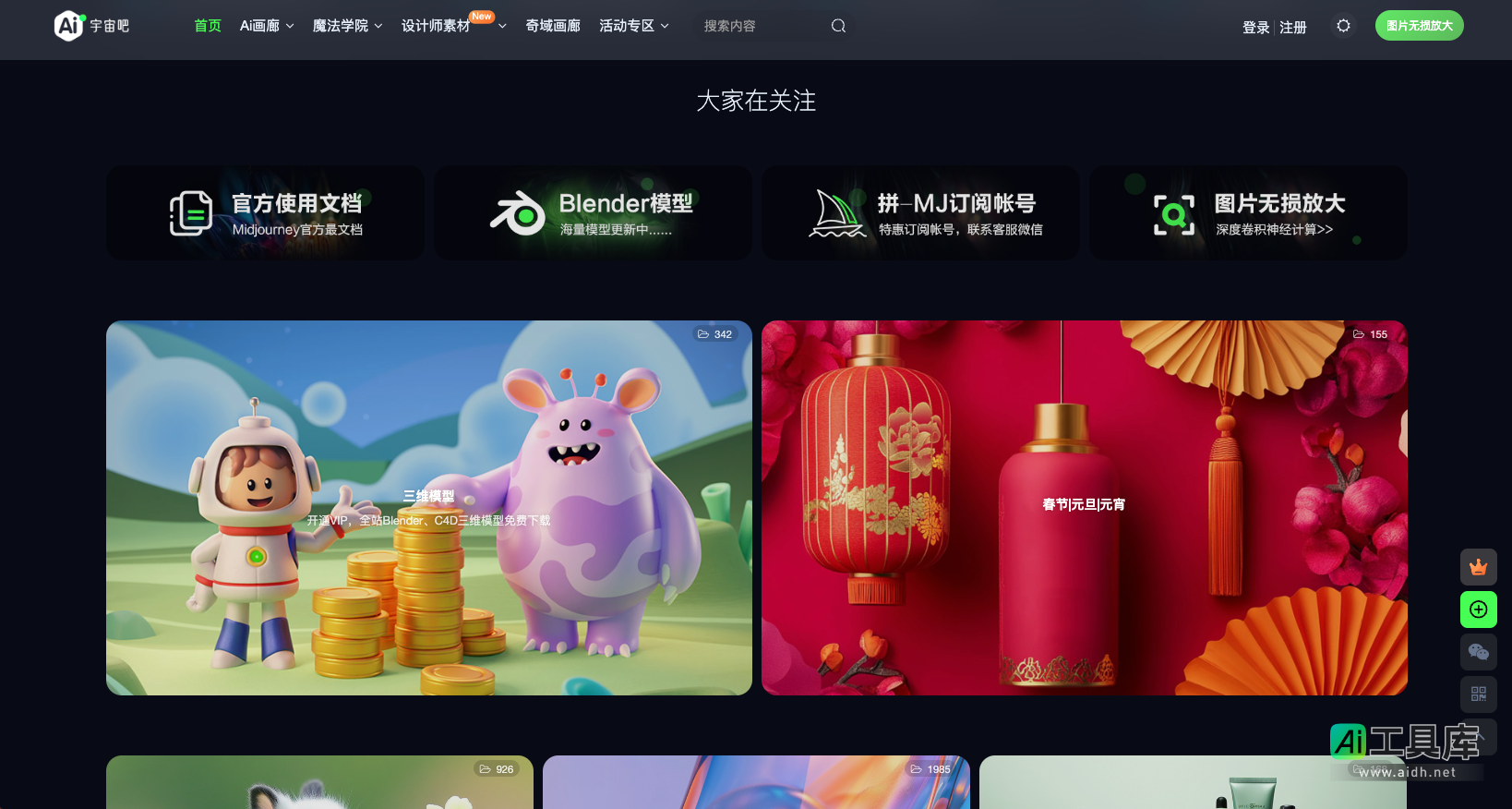 AI宇宙吧不仅关注AI绘画,还提供大量设计师素材: