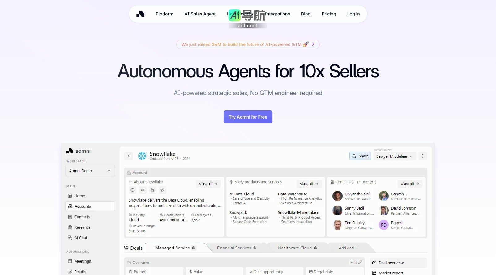- 全周期AI支持:Aomni的AI代理能够理解客户的理想客户画像、市场差异化和市场环境,从而为销售人员提供所需的信息,帮助他们制定战略账户计划和可立即使用的交付物。