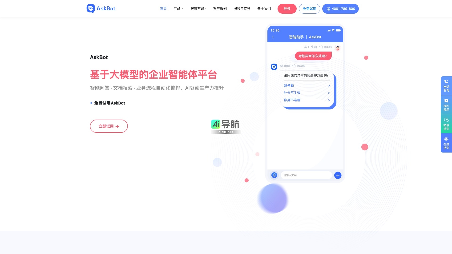 AskBot是一款基于大模型的企业智能体平台,致力于通过智能问答、文档搜索以及业务流程自动化编排来提升企业的生产力。它为企业提供了一个强大的AI助手,能够在多个方面为员工提供支持和服务。