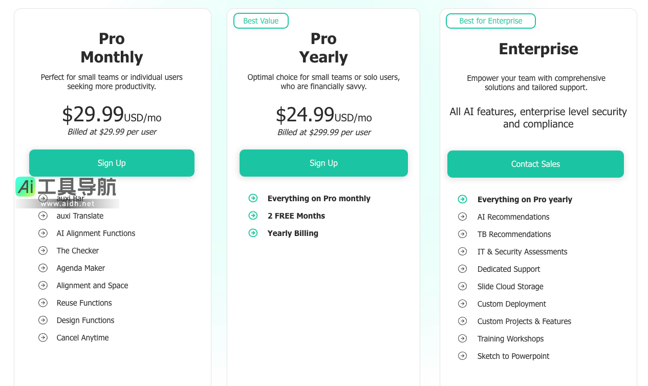 Auxi为用户提供了灵活的定价方案,以满足不同规模的团队需求。对于个人用户或小型团队,Auxi提供了按月或按年计费的Pro版,用户可以根据自己的需求选择合适的计划。同时,Pro版用户还可以享受AI推荐、翻译、对齐和空间管理等多项高端功能,帮助他们进一步提高工作效率。