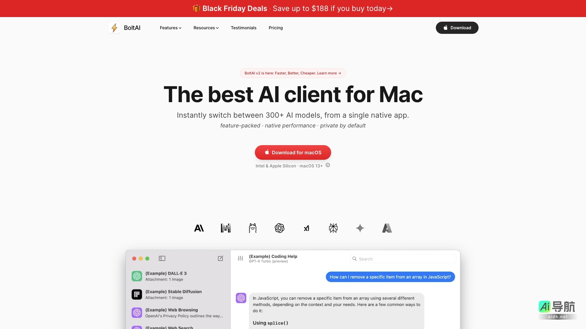 BoltAI是一款专为Mac用户设计的高效AI客户端,旨在提升用户的工作效率。它支持用户在一个本地应用中快速切换300多种AI模型,提供了强大的功能和原生性能,确保用户在使用过程中享有隐私保护。以下是BoltAI的主要特点和功能介绍:
