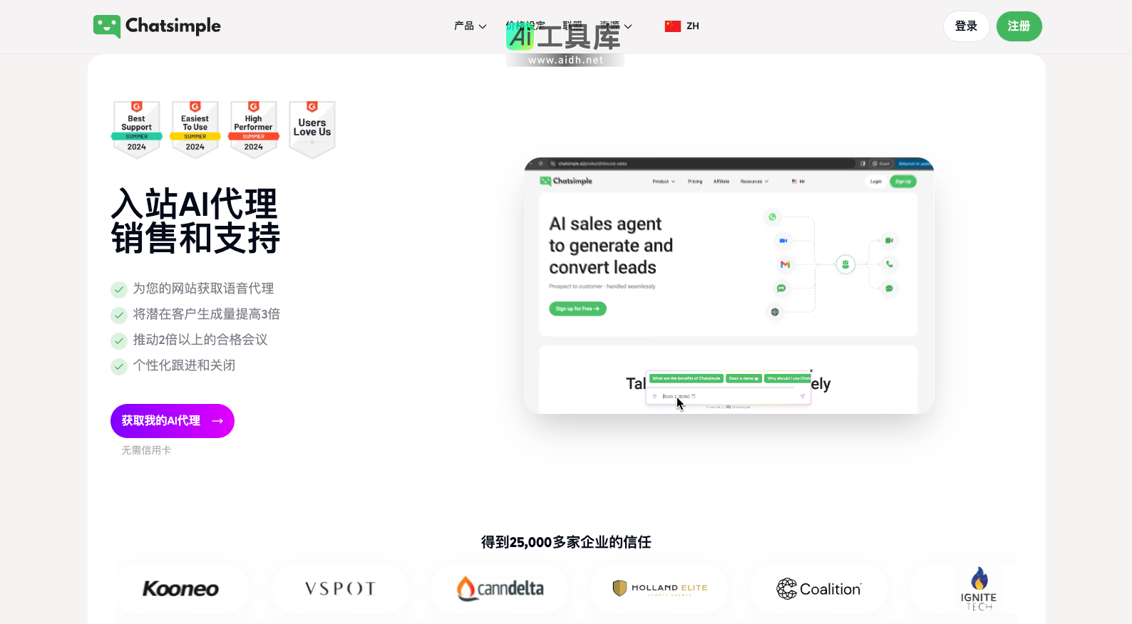 Chatsimple是一个创新的AI聊天机器人平台,旨在通过个性化的销售支持和客户服务提升业务效果。这个先进的平台承诺将潜在客户生成提高3倍,并通过个性化的跟进和成交使合格的会议数量翻倍。凭借支持175多种语言的强大聊天和语音AI,Chatsimple在无需任何编码技术的情况下,提供与客户无缝互动的能力。这无疑为企业在全球范围内的客户交流开辟了新的通道。
