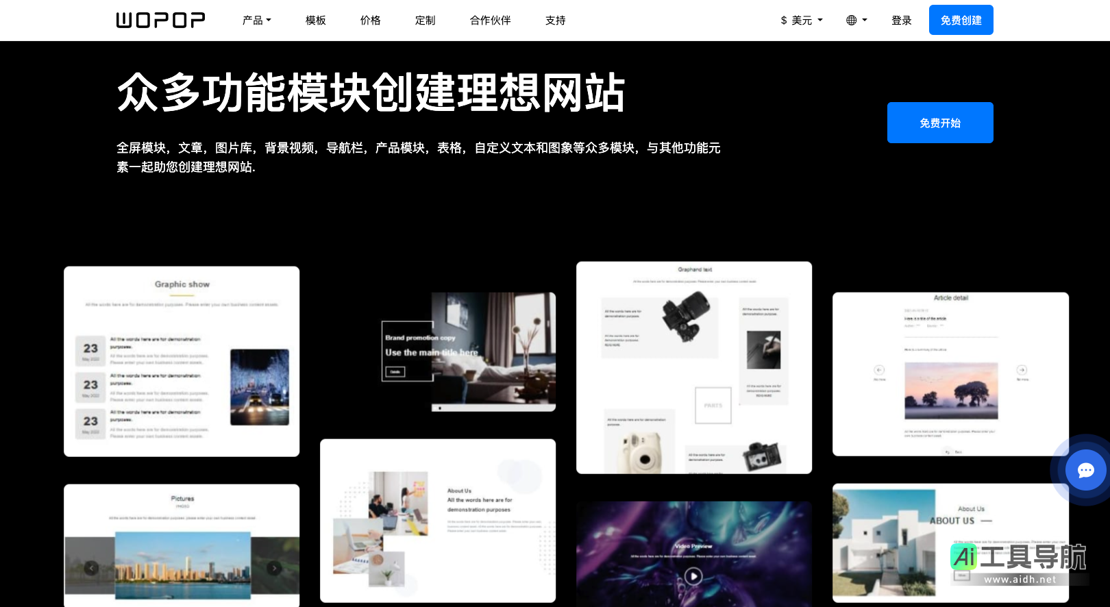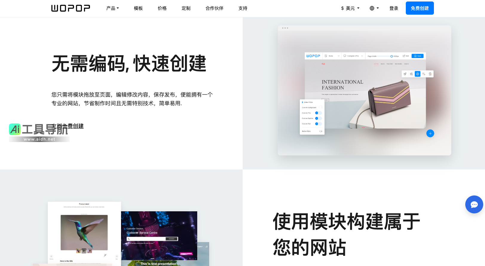 Wopop的最大优势在于其零编程门槛的建站功能,允许用户通过拖拽操作和模块组合,快速搭建出精美且功能齐全的网站。平台提供了丰富的免费模板和模块,涵盖了从简洁的企业展示到复杂的电商平台等多种需求。用户可以在这些模板中自由选择,依据自己的需求进行个性化定制。