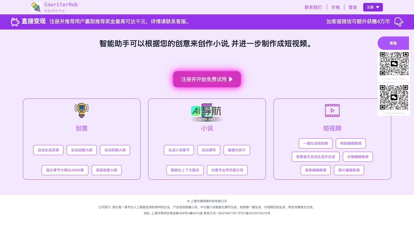 作为一家专注于人工智能应用的高科技企业,CowriterHub 的产品涵盖短篇小说、中长篇小说的智能化撰写生成、短视频和长视频的总结生成,以及特定场景的推文生成,致力于为创作者提供全面的支持和服务。