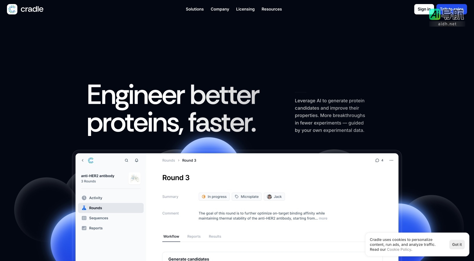 Cradle是一款基于人工智能的蛋白质设计平台,旨在帮助科研团队更快速地生成和优化蛋白质候选者。通过利用自身的实验数据,Cradle能够在更少的实验中实现更多的突破,极大地提高了蛋白质工程的效率。该平台已经被诺和诺德、强生和IFF等知名科学团队所信赖,帮助他们加速蛋白质的优化过程。