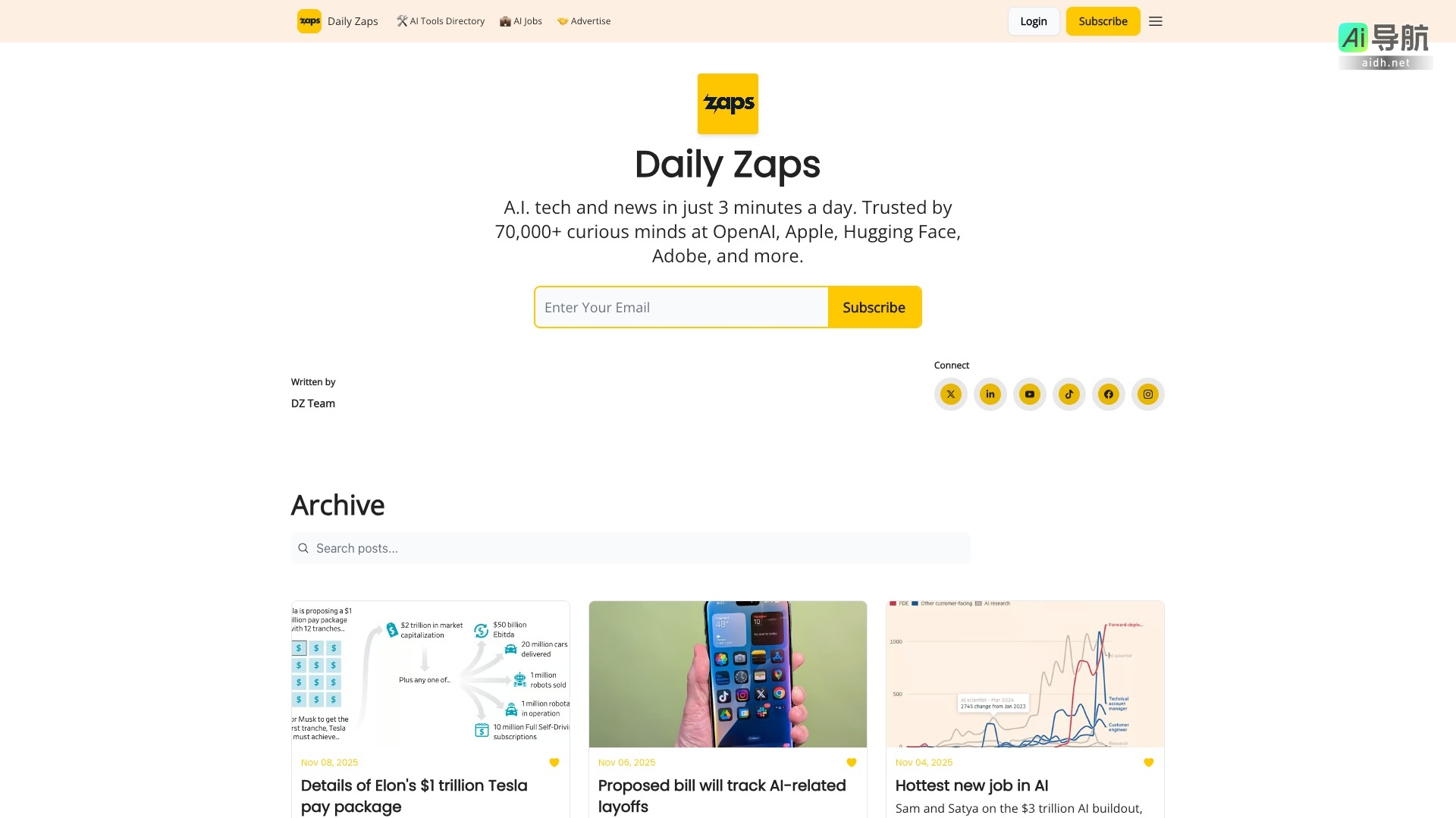 Daily Zaps 还设有 AI 工具目录和 AI 职位板块,方便用户寻找合适的工具和职业机会。这些功能使得网站不仅是获取信息的渠道,也是职业发展的助力。