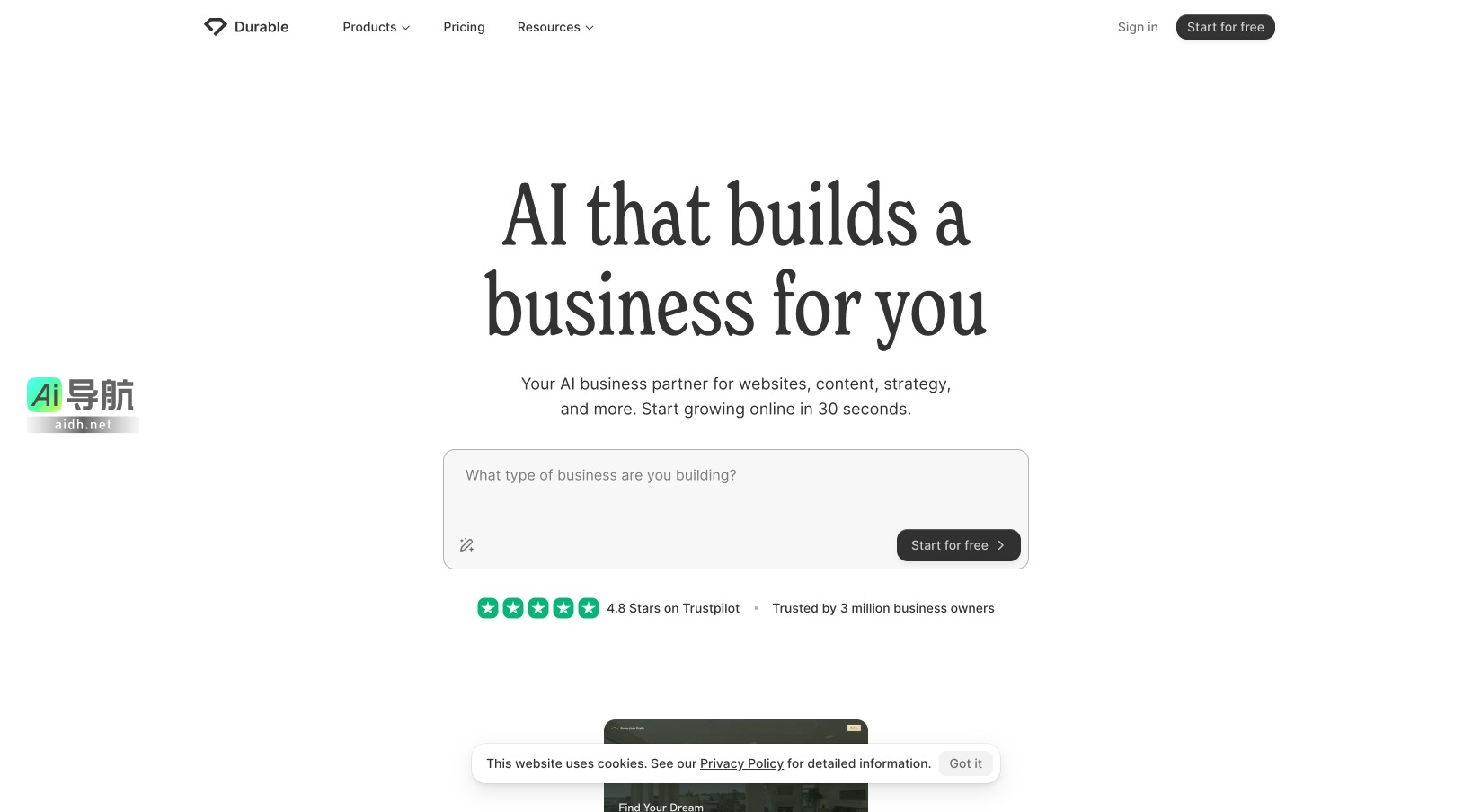 Durable是一款强大的AI驱动网站构建工具,旨在帮助用户快速创建和管理他们的在线业务。以下是对Durable的全面介绍: