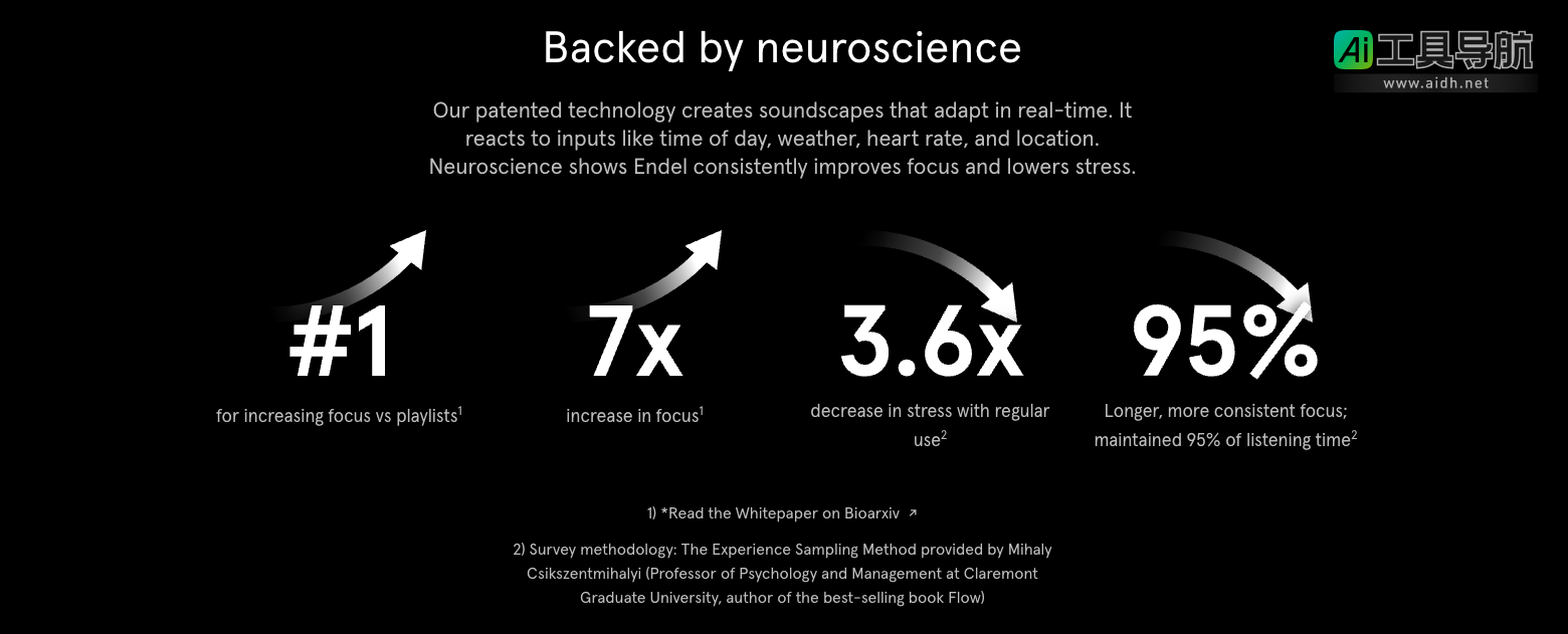 Endel 的所有声音景观和场景设置都基于神经科学和生物学的研究,致力于通过声音来优化人的生理和心理状态。研究表明,Endel 能有效提高专注力,降低压力水平,提升工作效率。通过科学的实验和数据支持,Endel 显示出相较于传统的音乐播放列表,能够带来更长时间、更稳定的专注力,以及更好的放松效果。