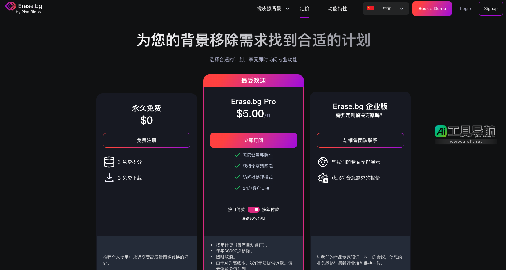 Erase.bg 提供了免费版本,允许个人用户免费处理图像背景,并下载高清图像。对于需要高级功能的用户,如大规模图像处理或商业用途,可以选择升级到 PixelBin.io 的订阅计划,享受更高效的专业服务。这种灵活的定价模式,使得无论是个人用户还是企业,都能找到适合自己的解决方案。