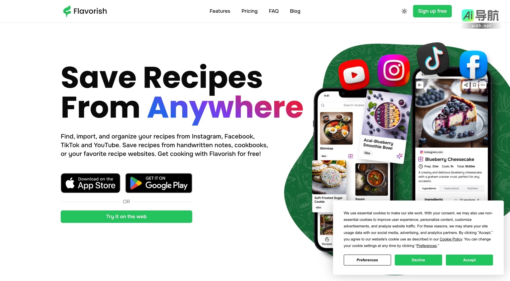 - 保存食谱的多样性:用户可以从 Instagram、Facebook、TikTok 和 YouTube 等社交媒体平台保存食谱,只需简单分享即可。同时,用户也可以上传手写食谱或食谱书的照片,Flavorish 会自动提取并保存这些食谱。