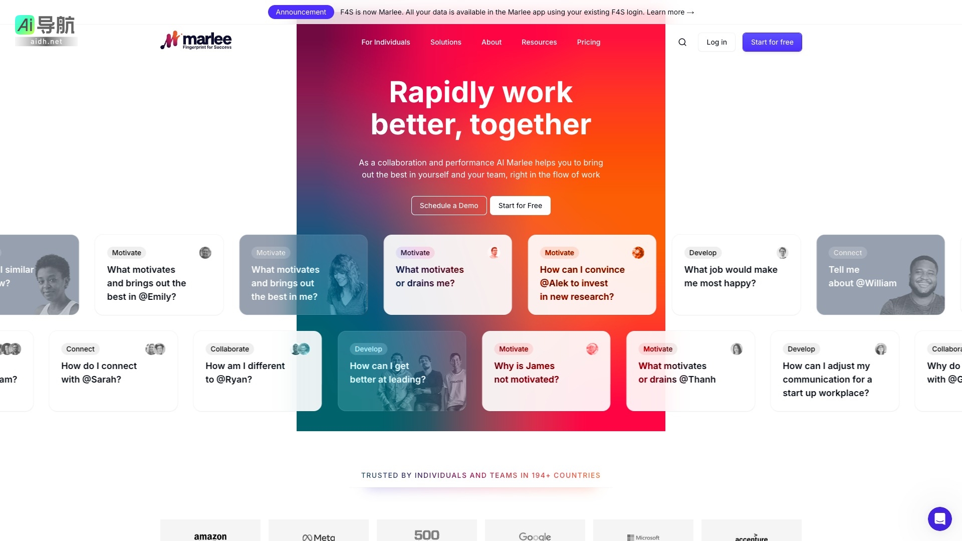 Marlee是一款创新的协作与绩效人工智能工具,旨在帮助个人和团队在工作中发挥最佳表现。它通过分析个人的动机和工作风格,提供个性化的反馈和指导,从而提升团队的整体效能。以下是Marlee的主要功能和适用场景: