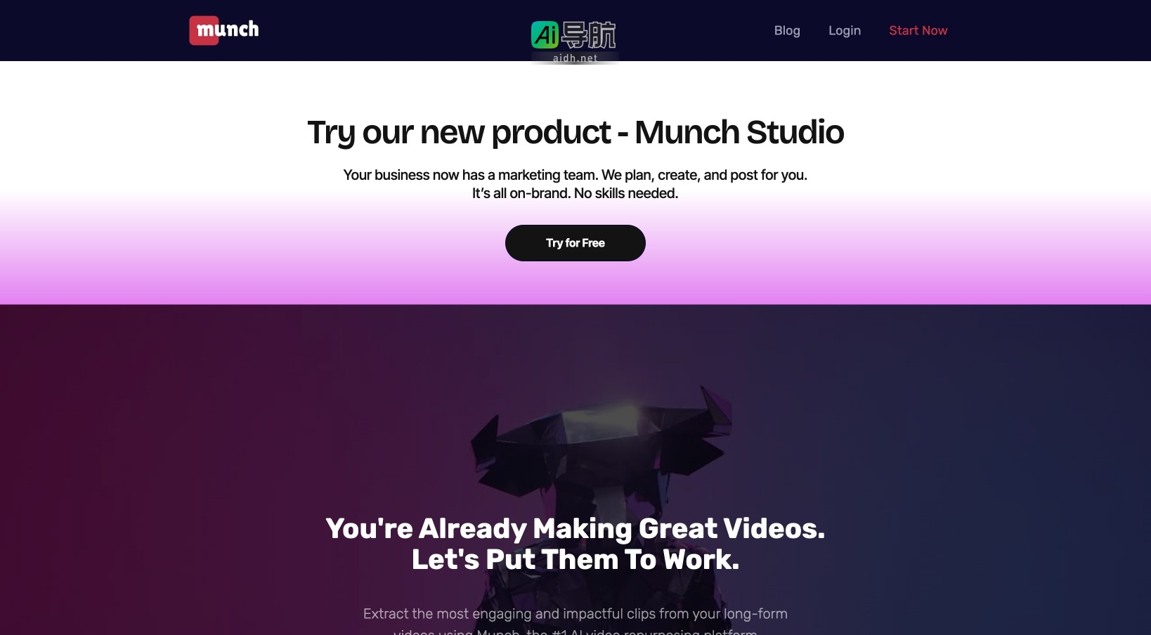 - 利用顶级市场数据:Munch背后强大的AI能力(如GPT、OCR和NLP)能够分析视频内容,并结合社交和市场趋势,帮助用户制定成功的内容策略。