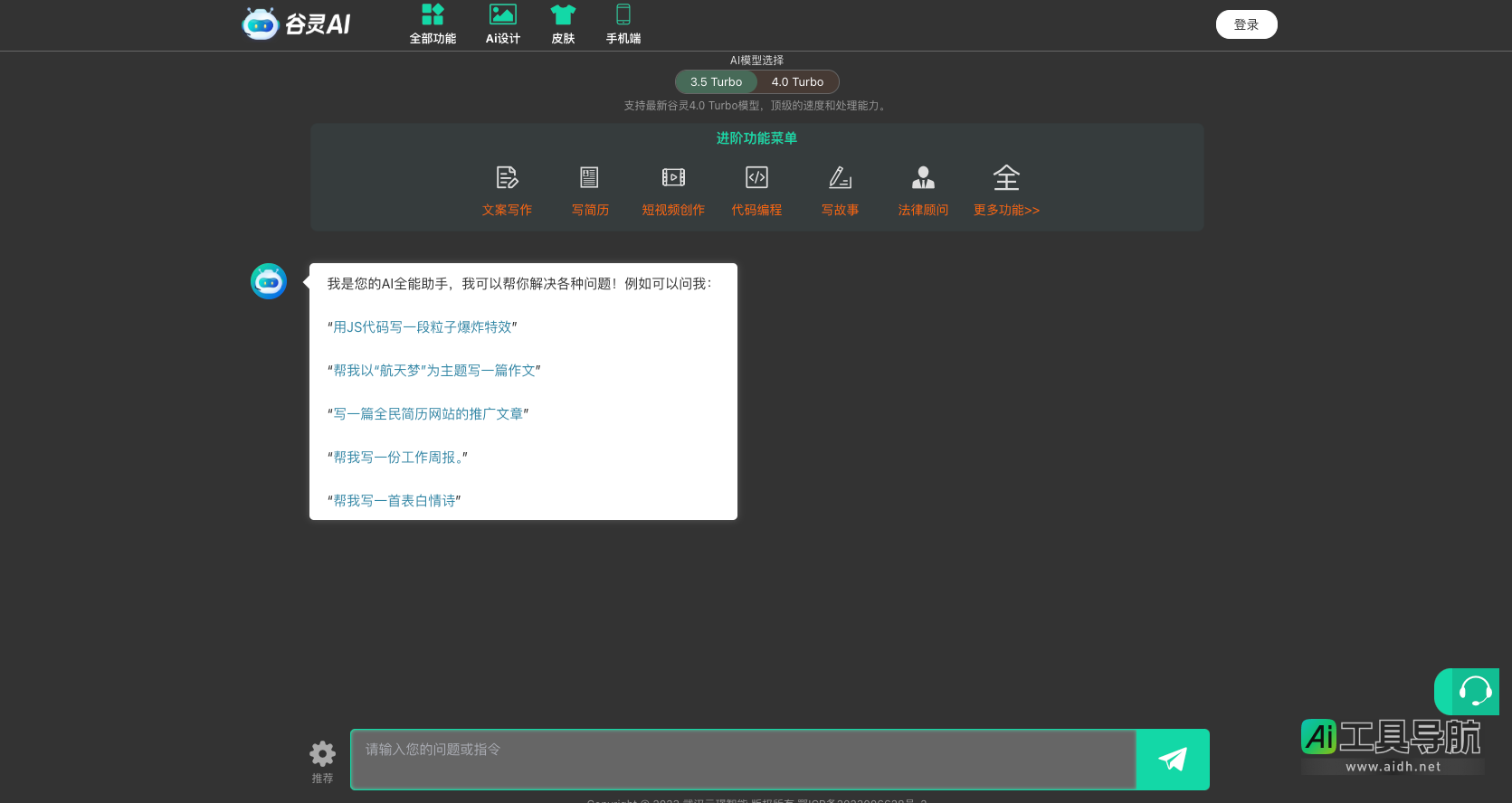 谷灵AI作为一款功能强大的AI助手,专注于提供一系列高效的人工智能服务,涵盖了从文案创作到编程、从简历写作到法律咨询的多种应用场景。它不仅可以大幅提升工作效率,还能够为用户提供全方位的智能支持,是现代职场人和创作者的得力助手。