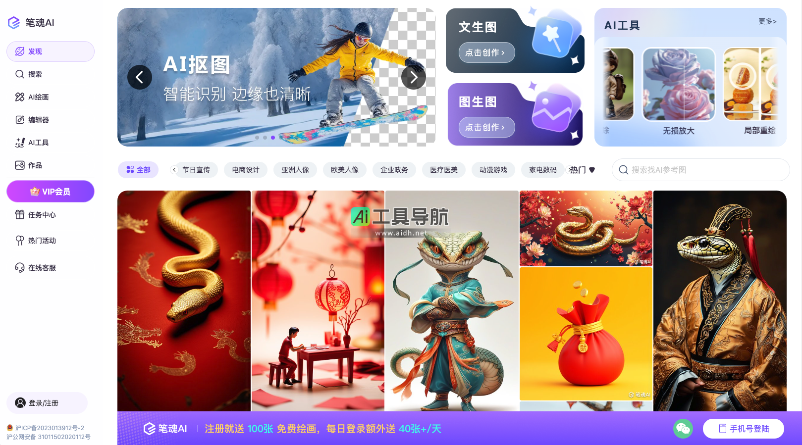 笔魂AI绘画不仅适用于个人创作,它也在商业和娱乐领域中发挥着重要作用。对于电商设计,AI可以帮助商家生成商品展示图、海报、宣传册等,提升品牌形象。对于节日宣传,平台提供了丰富的节日主题图像生成选项,帮助商家轻松制作节庆氛围浓厚的视觉内容。