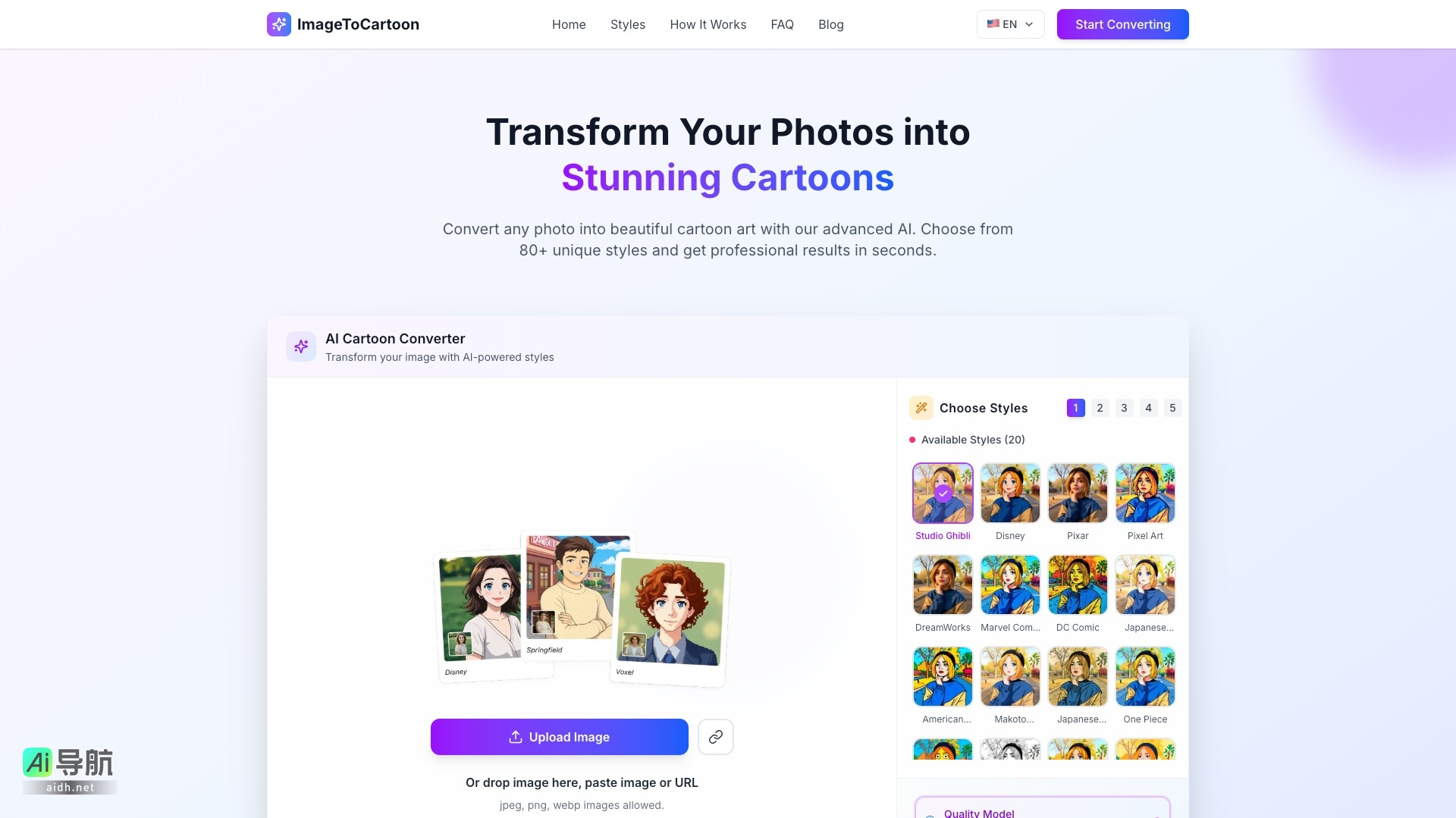 - 多样化的卡通风格:用户可以从经典的迪士尼风格到现代的动漫美学中选择,涵盖了如 Studio Ghibli、Disney、Pixar、DreamWorks 等多个风格,满足不同用户的需求。