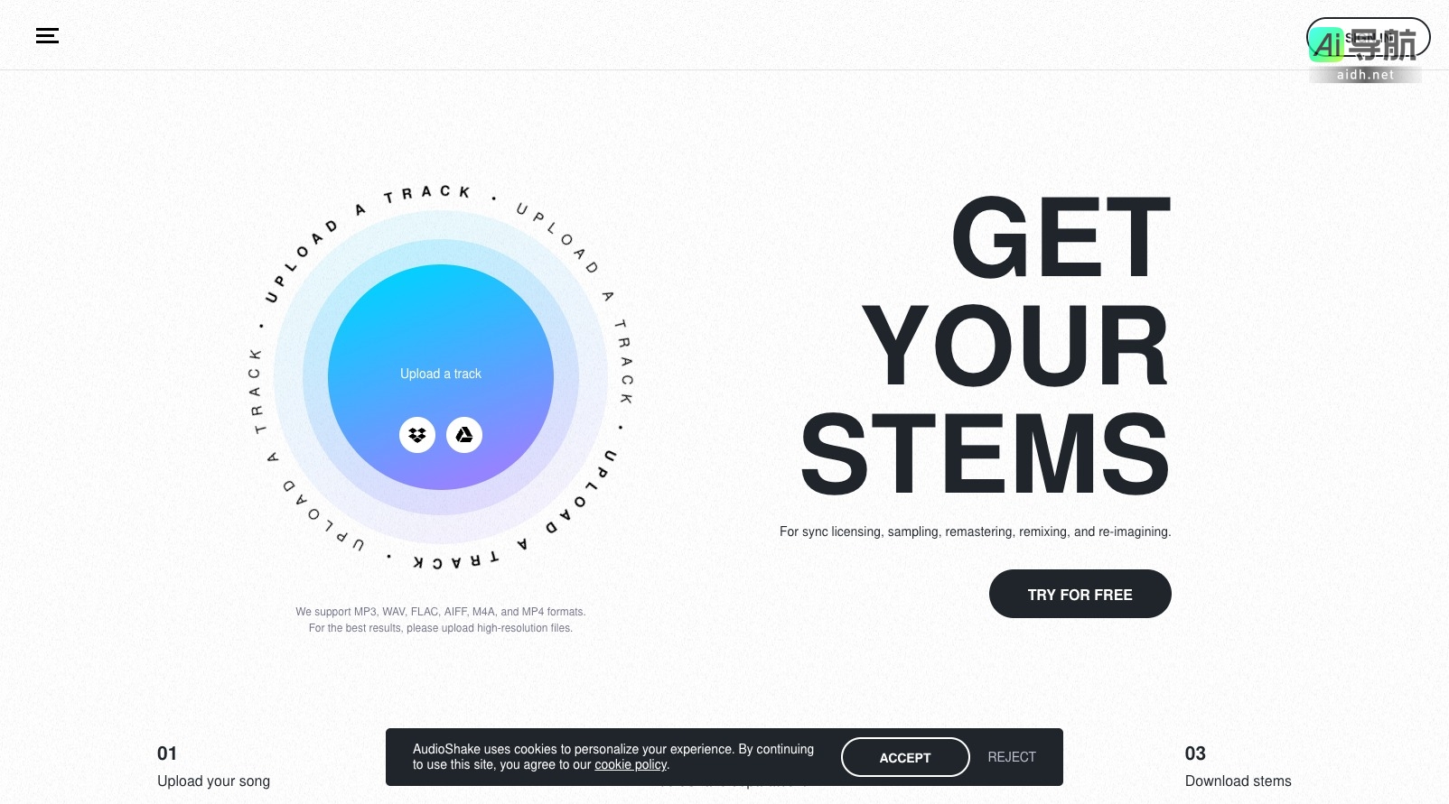 AudioShake 是一个专为音乐创作者、独立艺术家和制作人设计的平台,旨在简化音频处理和创作流程。用户可以通过该平台轻松上传音轨,支持多种音频格式,包括 MP3、WAV、FLAC、AIFF、M4A 和 MP4。为了获得最佳效果,建议用户上传高分辨率的文件。