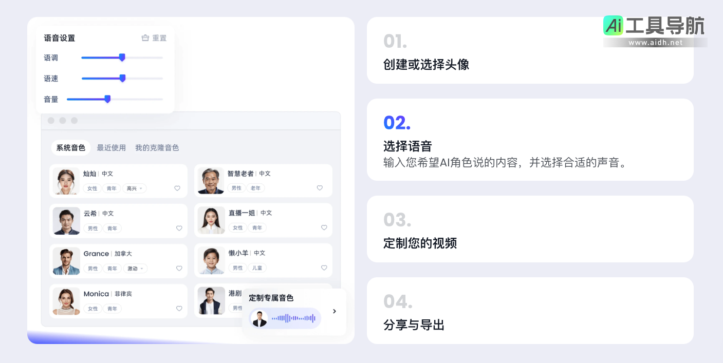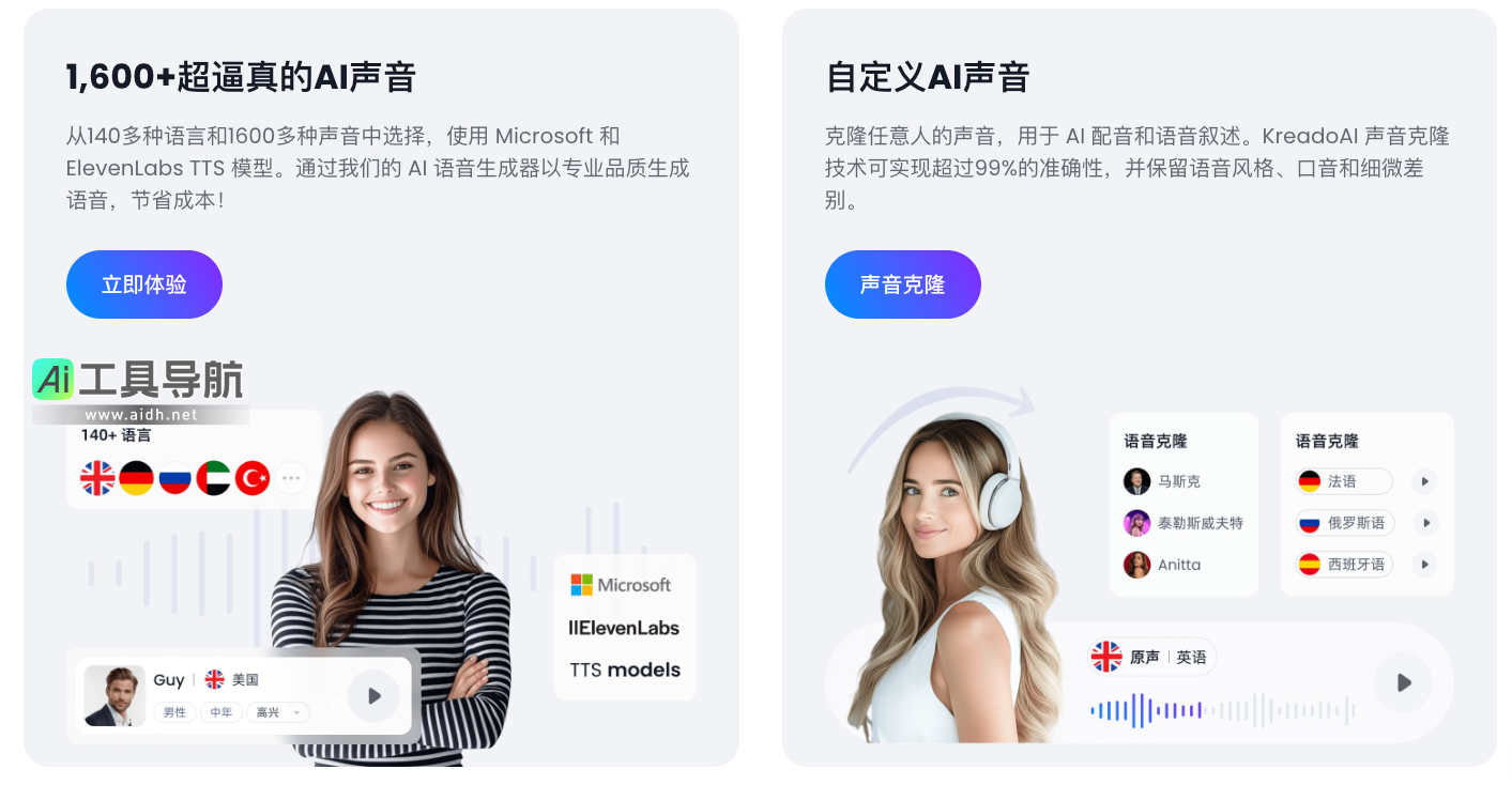 除了虚拟形象,KreadoAI还拥有超过1600种AI声音,支持140多种语言。用户可以根据需要选择合适的语音风格和语言,甚至能够克隆特定人物的声音,确保视频中的配音自然流畅,并且精准传达信息。无论是用于培训视频、广告宣传还是教育内容,KreadoAI都能提供多样化且专业的声音选项,满足不同场景的需求。