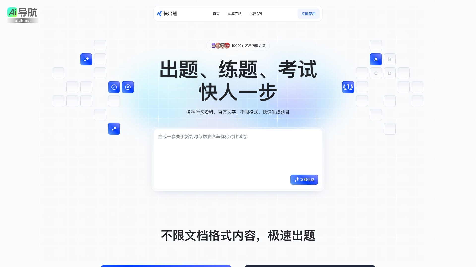快出题是一款专注于出题、练题和考试的智能工具,旨在为用户提供高效、便捷的学习体验。该平台拥有丰富的题库资源,支持多种文档格式的题目生成,适合各类学习场景和需求。