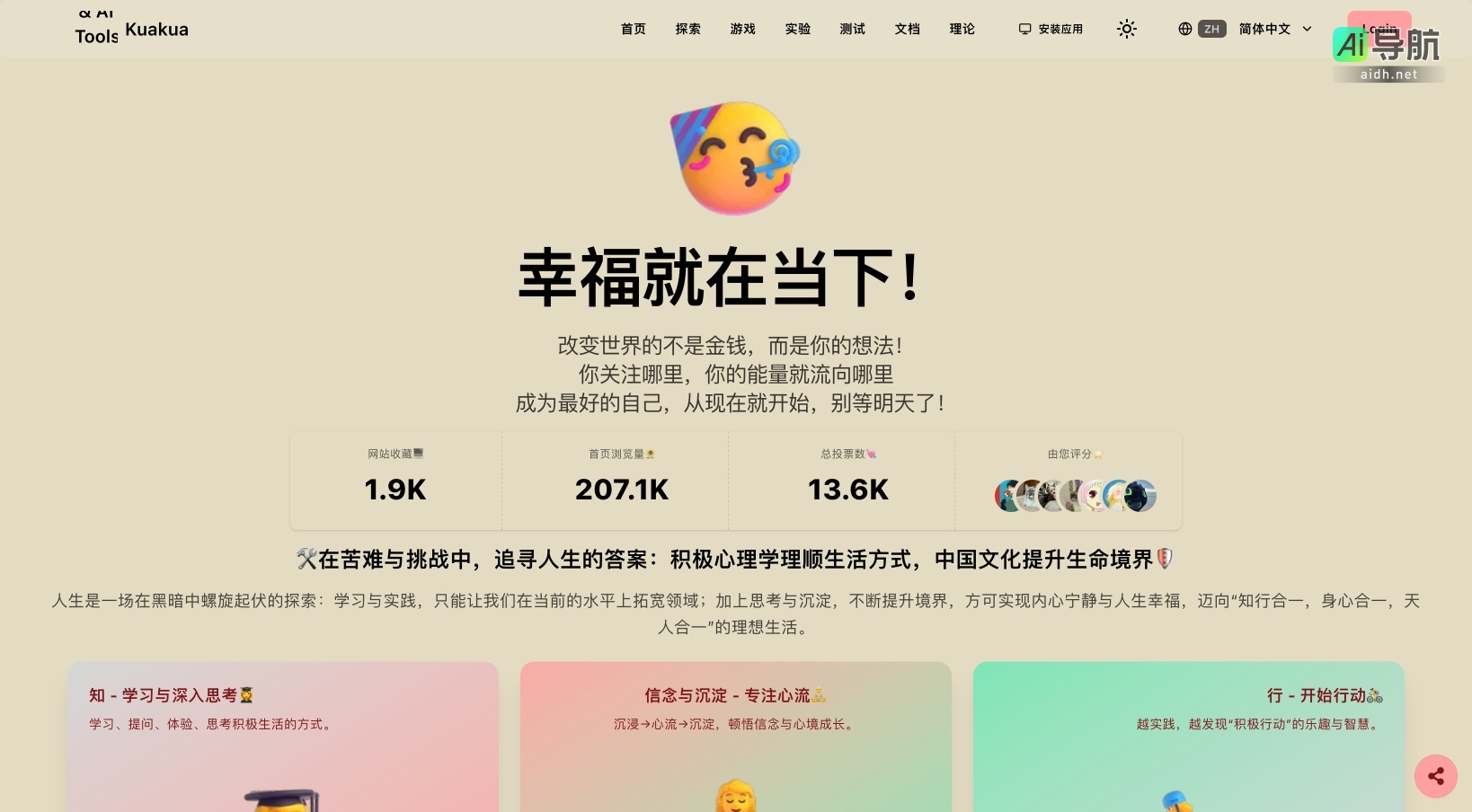 Kuakua 是一个致力于积极心理学和正念反思的在线平台,旨在帮助用户提升幸福感和生活质量。该网站不仅提供丰富的心理学资源,还通过互动体验和游戏化的方式,让用户在轻松愉悦的环境中探索自我,发现内心的力量。