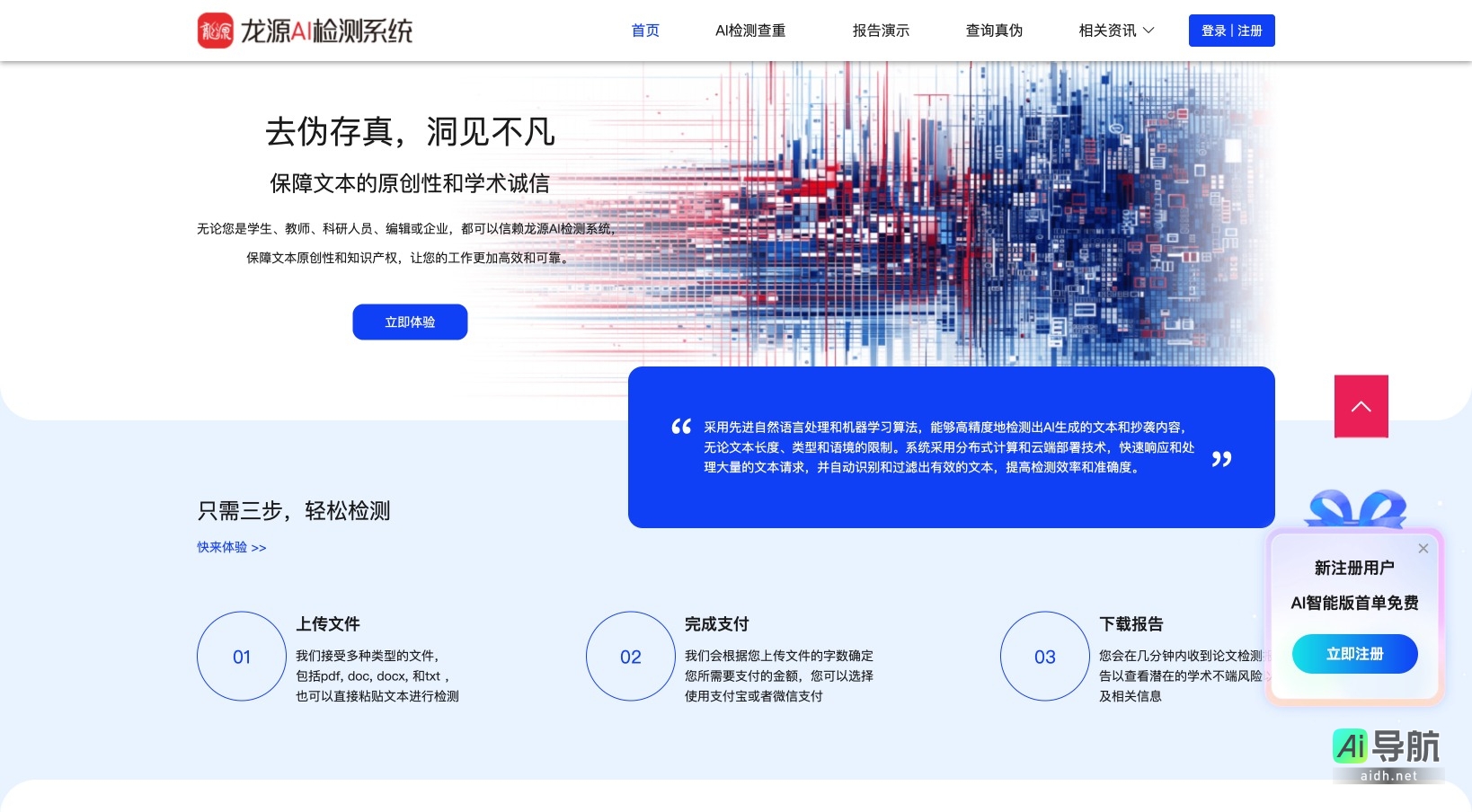 龙源AI检测系统不仅提供高效、准确的文本检测服务,还致力于构建一个公平、真实的学术环境,让人工智能更好地服务于知识应用和信息传播。新注册用户可享受AI智能版首单免费体验,进一步提升用户的使用体验。