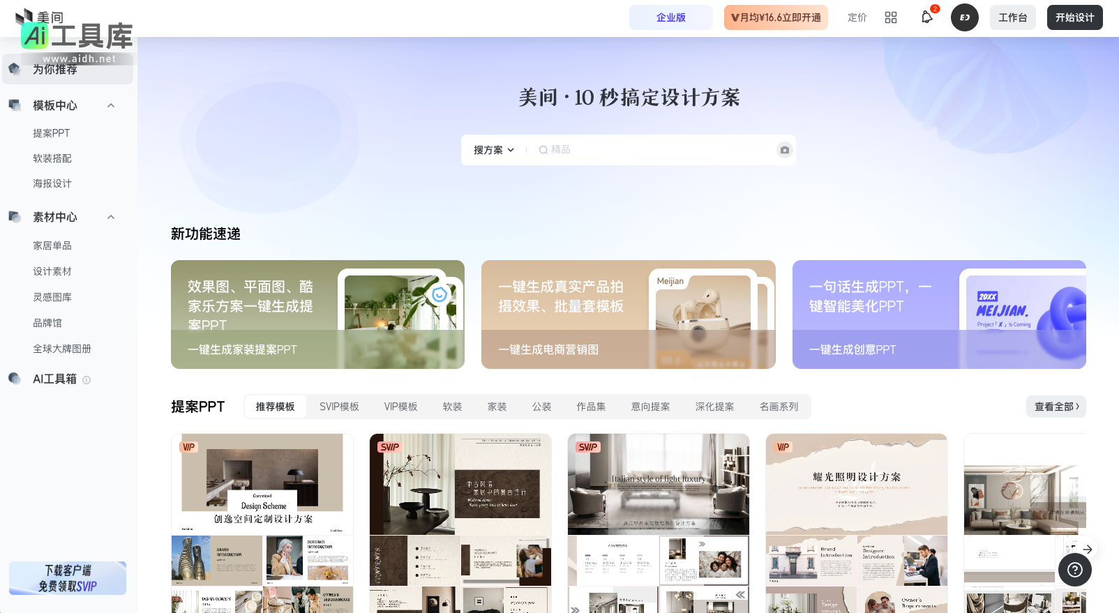在当今数字化时代,无论是家居设计师还是软装爱好者,对实用而高效的设计工具的需求都日益旺盛。而美间设计正是这样一款集创意与实用性于一体的网站。它不只是一个简单的设计工具,更是一个涵盖全方位软装解决方案的平台。通过其强大的功能和丰富的素材资源,用户可以轻松完成从软装设计到提案制作的整个流程。