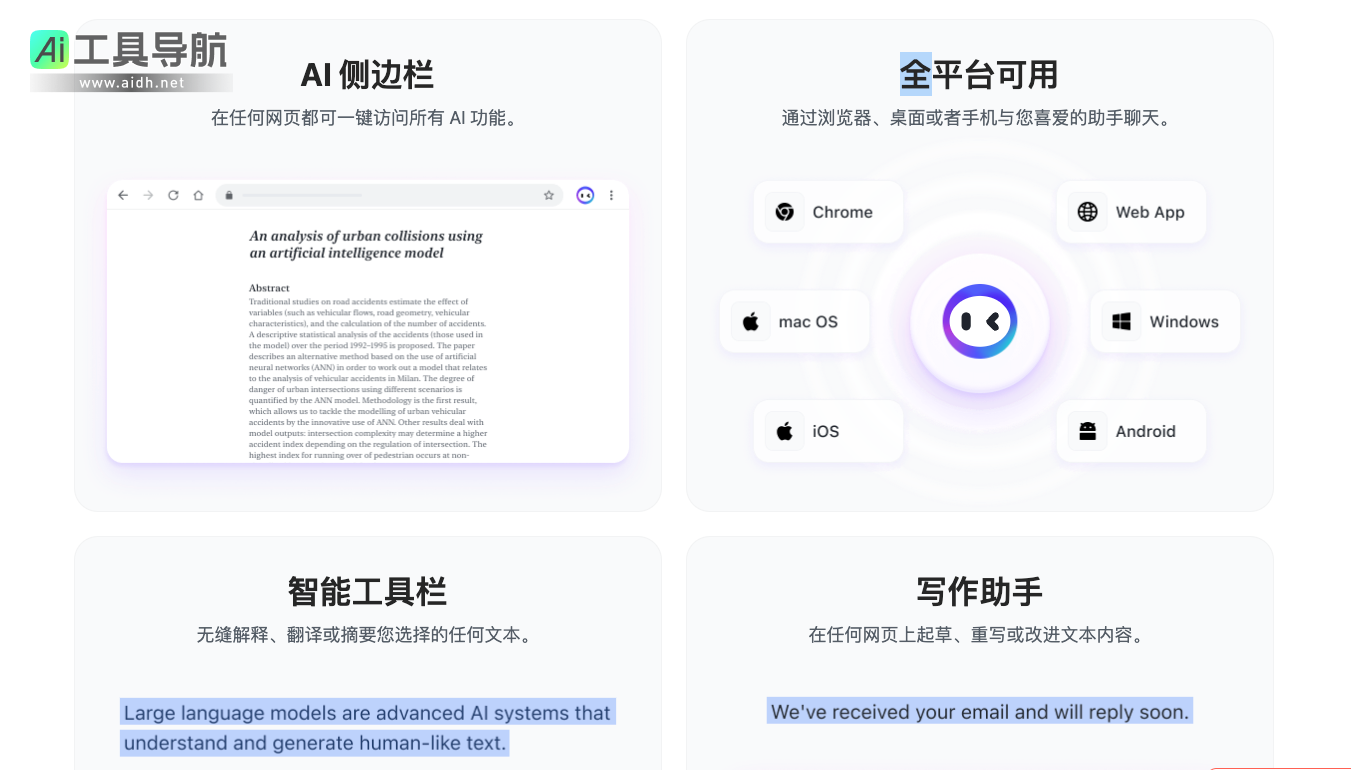 Monica 支持多种平台,用户可以在浏览器、桌面端和移动端都方便地使用它。通过 Monica,用户可以随时随地与 AI 互动,完成各种任务。在浏览器中,Monica 提供了智能工具栏,能够自动为用户解释、翻译或摘要所选文本。在桌面端和移动端,用户则可以体验更加完整的功能,包括与多个 AI 模型的实时对话、生成写作模板、以及对网页内容进行深入分析。