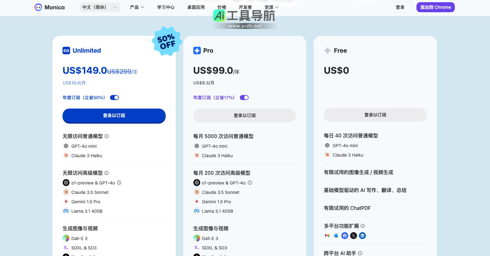 Monica 提供免费和付费版本,免费用户每天可以使用一定次数的功能,而对于需要更高频次使用的用户,付费版本提供了更多的GPU点、优先处理任务和高级功能。付费用户还能够享受更多文件上传的限制,并且可以解锁包括 AI 补帧等高级功能。