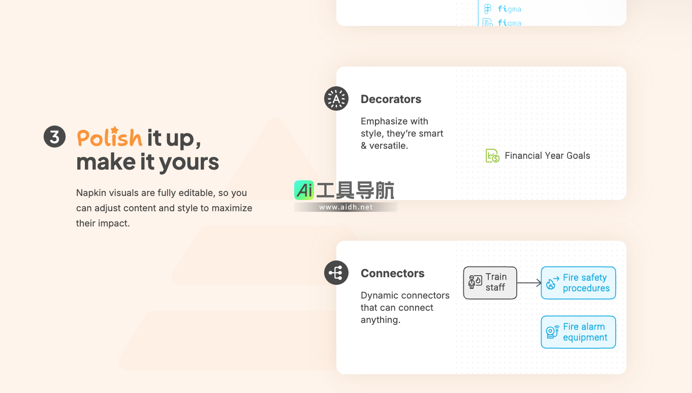 Napkin不仅仅生成静态的视觉图像,它还允许用户对生成的图形进行深入编辑。用户可以自由修改图标、连接器、颜色、字体等元素,从而定制符合个人或企业需求的视觉效果。Napkin提供了丰富的图标库和装饰元素,支持多种字体和配色方案,确保用户能够快速制作出符合品牌风格和沟通目标的图形内容。