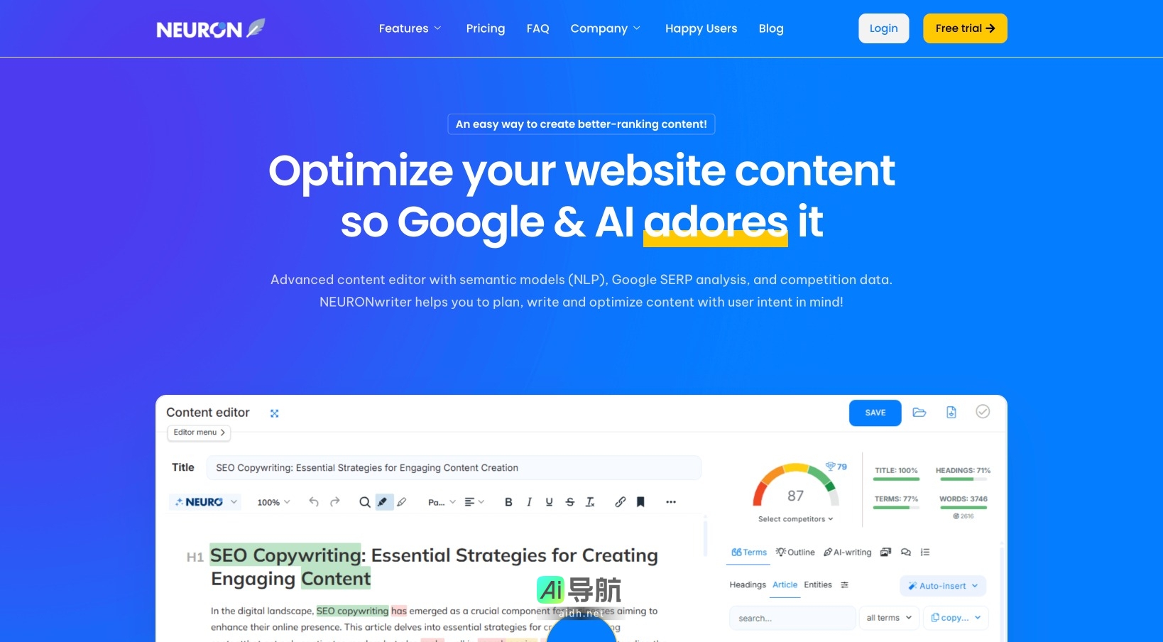 NEURONwriter不仅提供了强大的功能,还通过用户友好的界面使复杂的SEO优化变得简单易用。无论是新手还是经验丰富的内容创作者,都能在这个平台上找到适合自己的工具,帮助他们在内容创作和SEO领域取得成功。