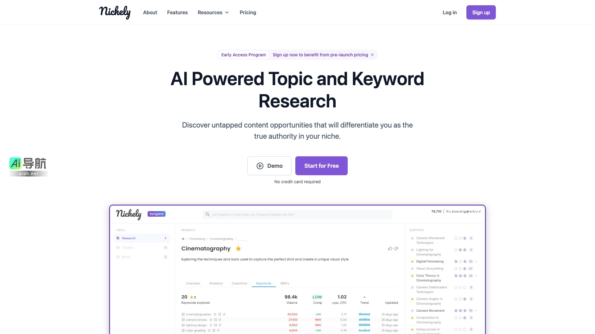 - 关键词研究:Nichely利用深度上下文分析,生成真正相关的长尾关键词,用户可以获取关键词的搜索量和竞争数据,进行SERP分析,帮助优化内容策略。
