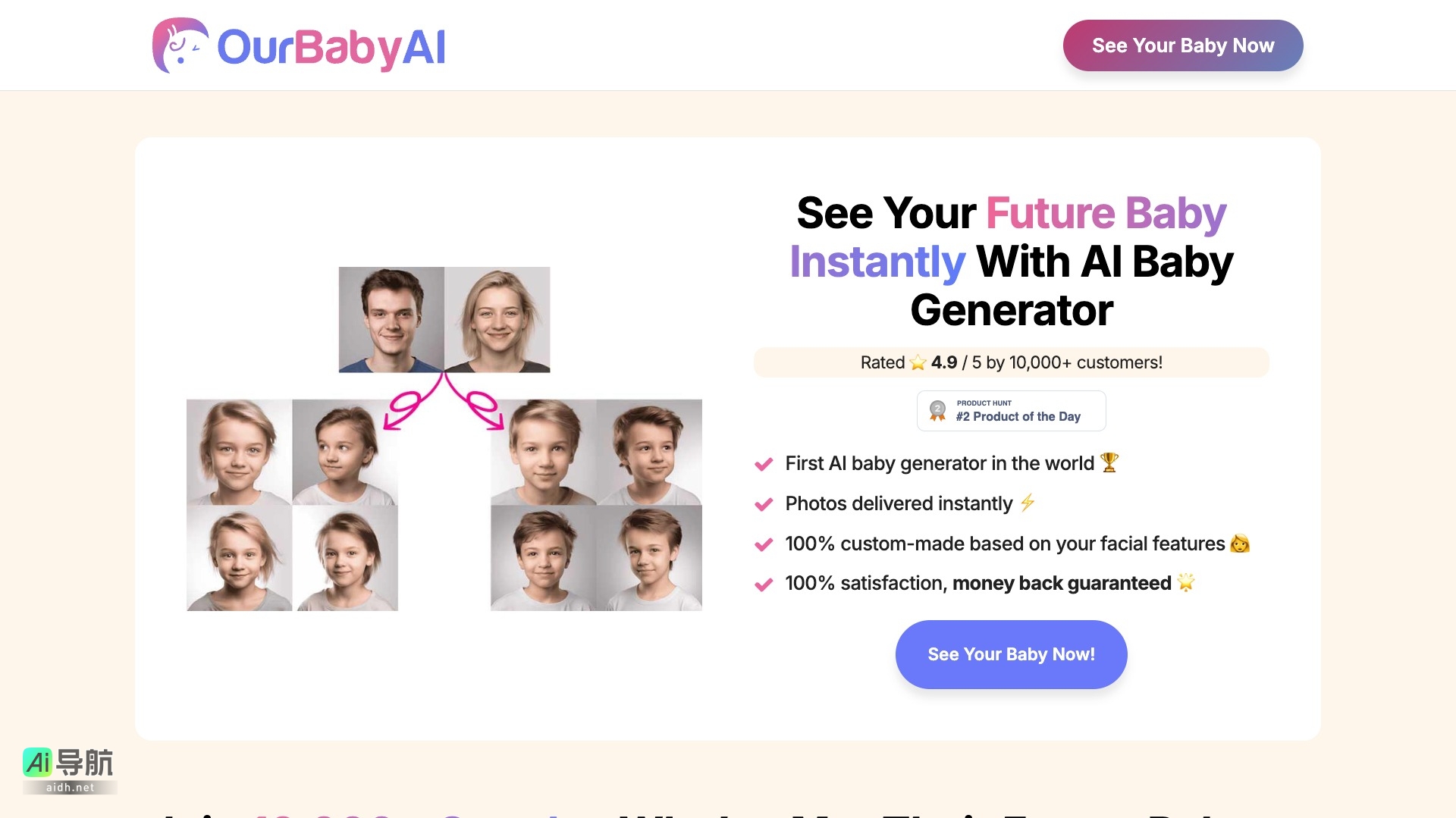 我们的AI宝宝生成器是全球首个此类产品,旨在通过先进的人工智能技术,让您瞬间看到未来宝宝的模样。我们的服务得到了超过10,000名客户的好评,评分高达4.9/5。无论是情侣、家庭还是朋友,您都可以通过我们的平台,轻松生成与您和伴侣面貌相似的未来宝宝照片。