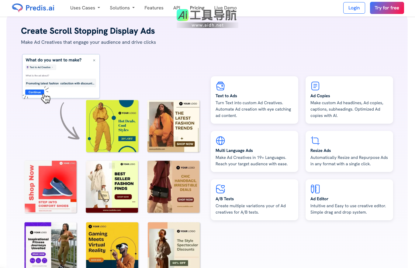 Predis AI 不仅支持传统的文本广告创作,还提供了多种广告创意格式,包括:
