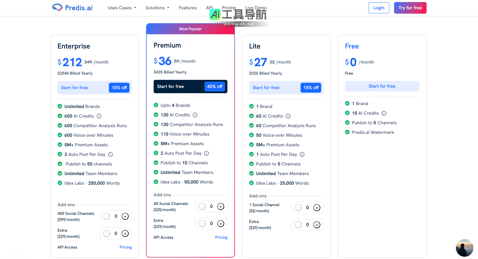 Predis AI 提供了免费试用选项,用户可以在不需要信用卡的情况下试用广告生成工具。对于需要更多功能的用户,平台还提供了多种收费计划,适用于不同规模的企业和广告需求。