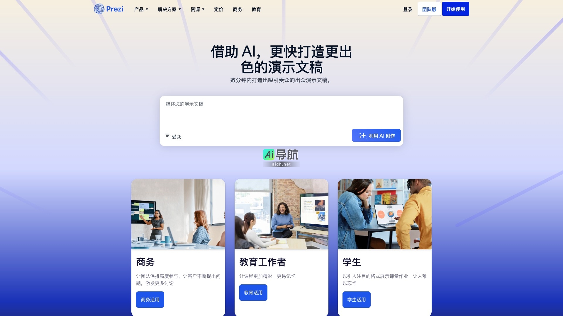 Prezi是一款创新的演示文稿工具,致力于通过AI技术帮助用户快速创建引人注目的演示内容。无论是商务会议、教育课程还是学生作业,Prezi都能提供独特的视觉效果和互动体验,提升受众的参与感和记忆度。