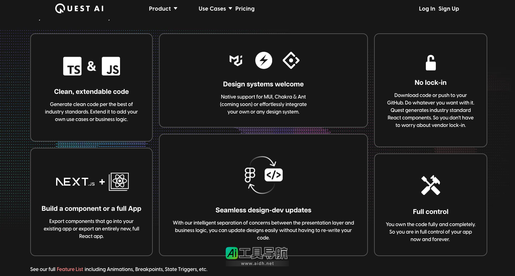Quest的核心功能是将Figma设计直接转换为React代码。用户只需将Figma设计上传至平台,Quest会自动识别设计元素,并生成符合行业最佳标准的React组件。这些组件是干净且易于扩展的,能够无缝融入现有的代码库中。对于开发者而言,Quest提供了一个无痛的方式,将设计稿转化为可以立即投入生产环境的代码。