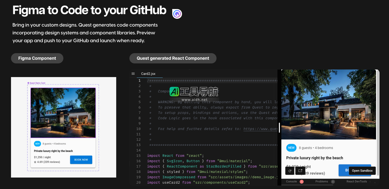 同时,Quest支持与Figma、GitHub等工具的深度集成。用户可以将Figma设计直接导入,生成React代码后推送到GitHub上进行版本控制。通过这些集成,开发者可以更加便捷地管理项目,并与团队成员进行高效的协作。