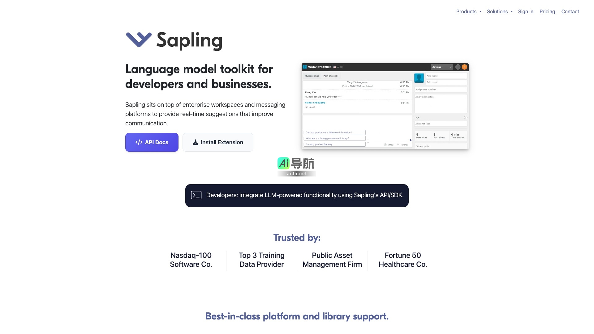 Sapling language model API toolkit and copilot for enterprise tasks. Sapling offers an API/SDK and turnkey integrations for grammar/spell checking, autocomplete, AI detection, paraphrasing, sentiment analysis, and more.