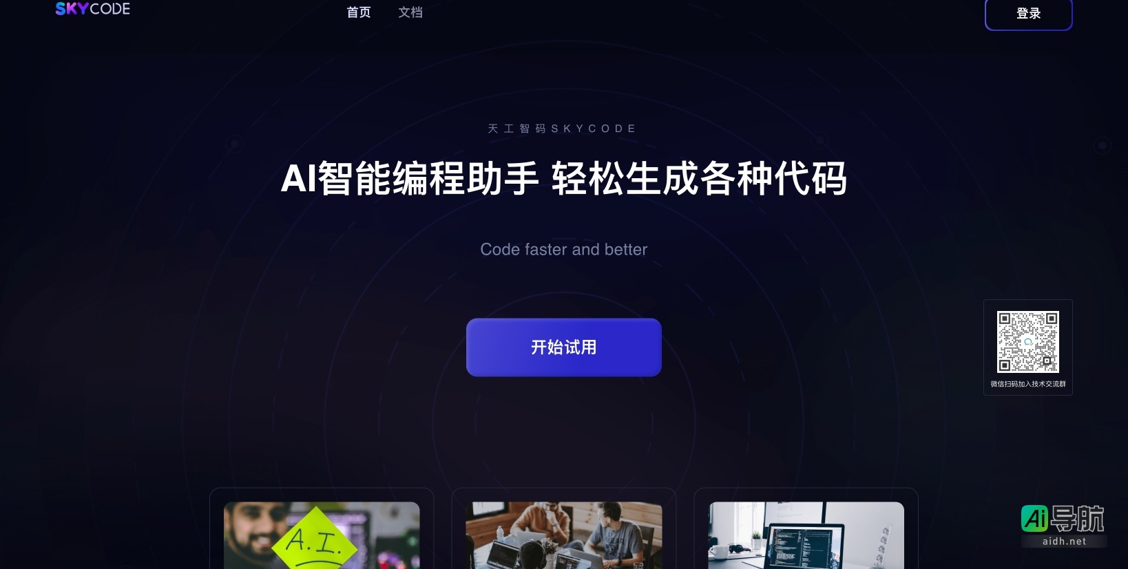 此外,天工智码SkyCode还提供了技术交流群,用户可以通过微信扫码加入,与其他开发者交流经验和技术。若有商务合作或其他咨询需求,用户可以通过指定邮箱进行联系。