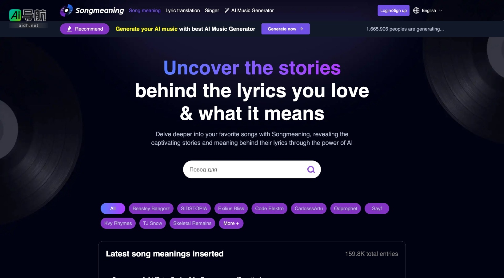 Song meaning是一个专注于揭示歌曲歌词背后故事和含义的平台,利用人工智能技术帮助用户深入理解他们喜爱的音乐作品。该网站的主要功能和特点包括: