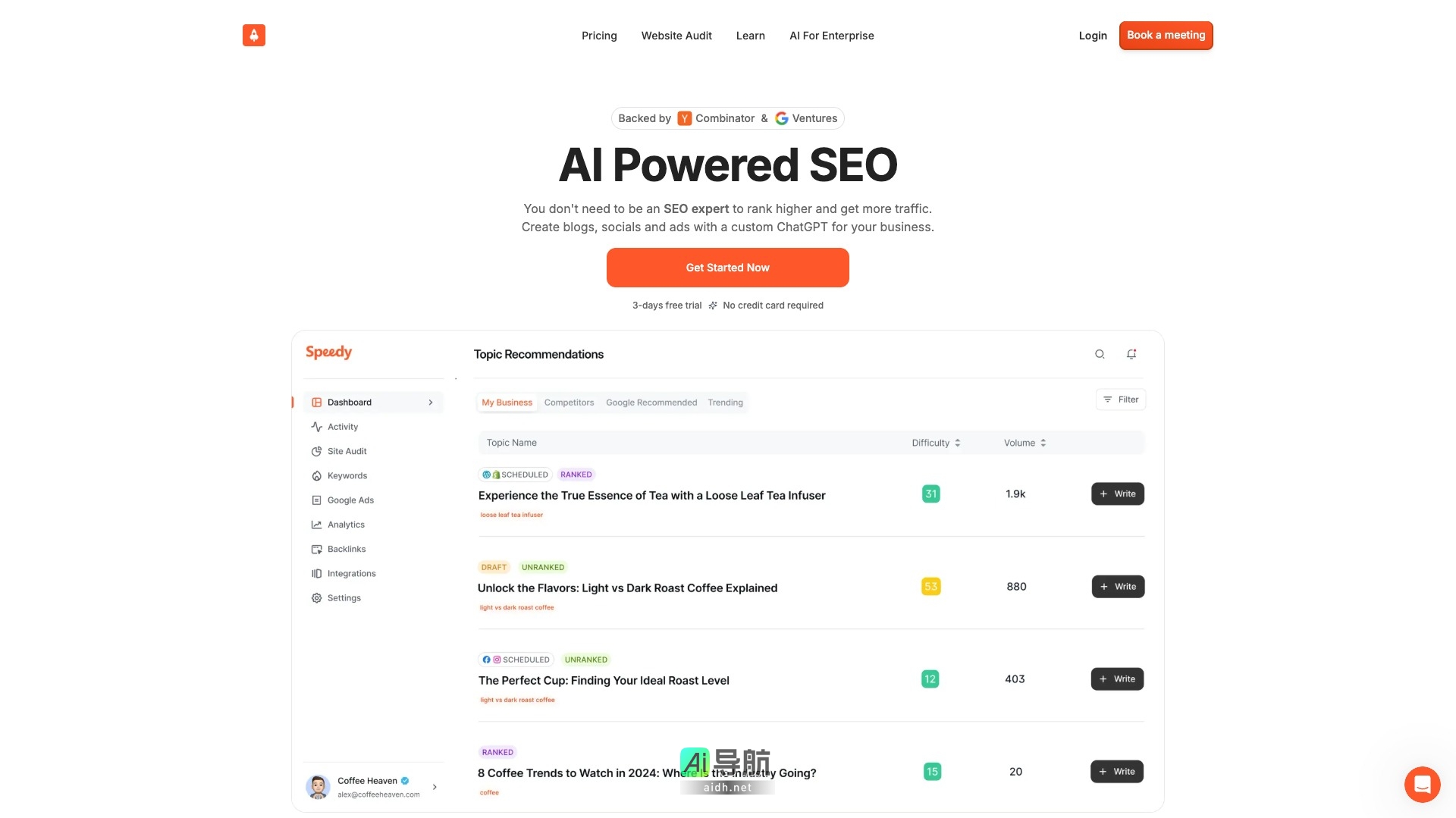 SpeedyBrand 是一款强大的 AI 驱动的 SEO 工具,旨在帮助企业提升在线可见度和流量。无论您是否是 SEO 专家,SpeedyBrand 都能为您提供所需的工具和支持,让您轻松创建高质量的博客、社交媒体内容和广告。