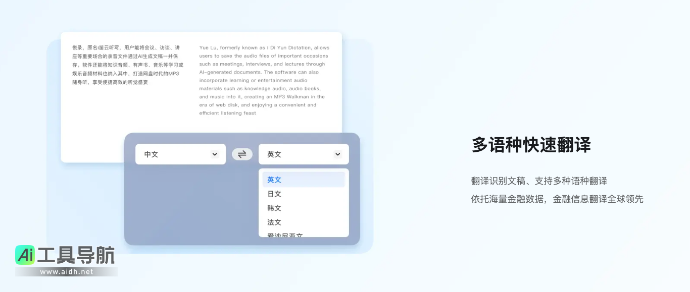 除了强大的录音转文字功能,悦录还支持多语种的快速翻译。通过悦录,用户不仅能够将录音内容转写成文字,还能进一步对文稿进行语言翻译,支持中文、英文、法语等多种语言的互译。这一功能特别适用于跨国公司、外语学习者以及需要多语言支持的用户。