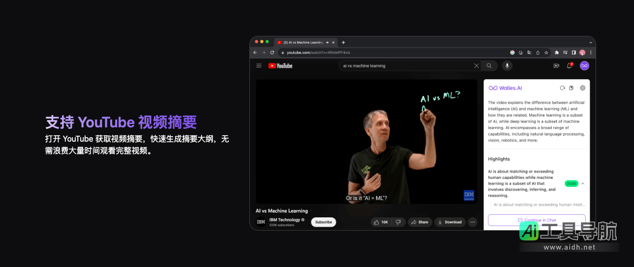 Walles.AI的使用非常简单,用户只需通过Chrome扩展程序添加该工具,便可以立即开始使用。无论是在网页浏览时快速总结文章内容,还是在YouTube视频中提取信息,操作流程都非常直观,用户只需选择需要处理的文本或视频,Walles.AI就能立刻提供解答。