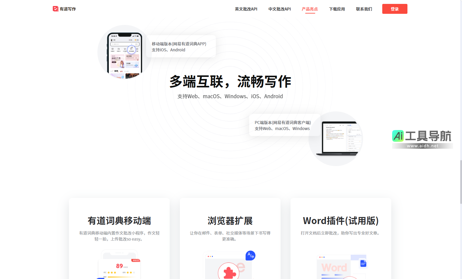 有道写作提供了Web、macOS、Windows、iOS、Android等多端支持,让用户可以在任何设备上自由切换,随时随地进行写作和批改。特别是移动端版本,内置在网易有道词典APP中,用户可以轻松在手机上拍照上传作文并快速获取批改结果。此外,浏览器扩展和Word插件也让用户能够在邮件、社交媒体以及Word文档中直接进行写作批改,确保各类写作场景都能得到充分支持。