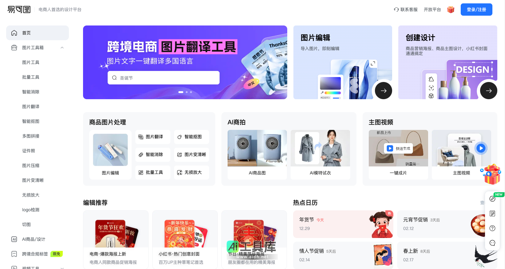 易可图的最大亮点之一就是其强大的AI图像处理能力,特别是在商品图编辑方面,平台提供了多项智能化功能,包括AI智能换背景、AI模特试衣、一键抠图、图片批量编辑等。这些功能能够帮助用户大幅度提高编辑效率,同时确保每一张商品图都符合电商平台的标准。