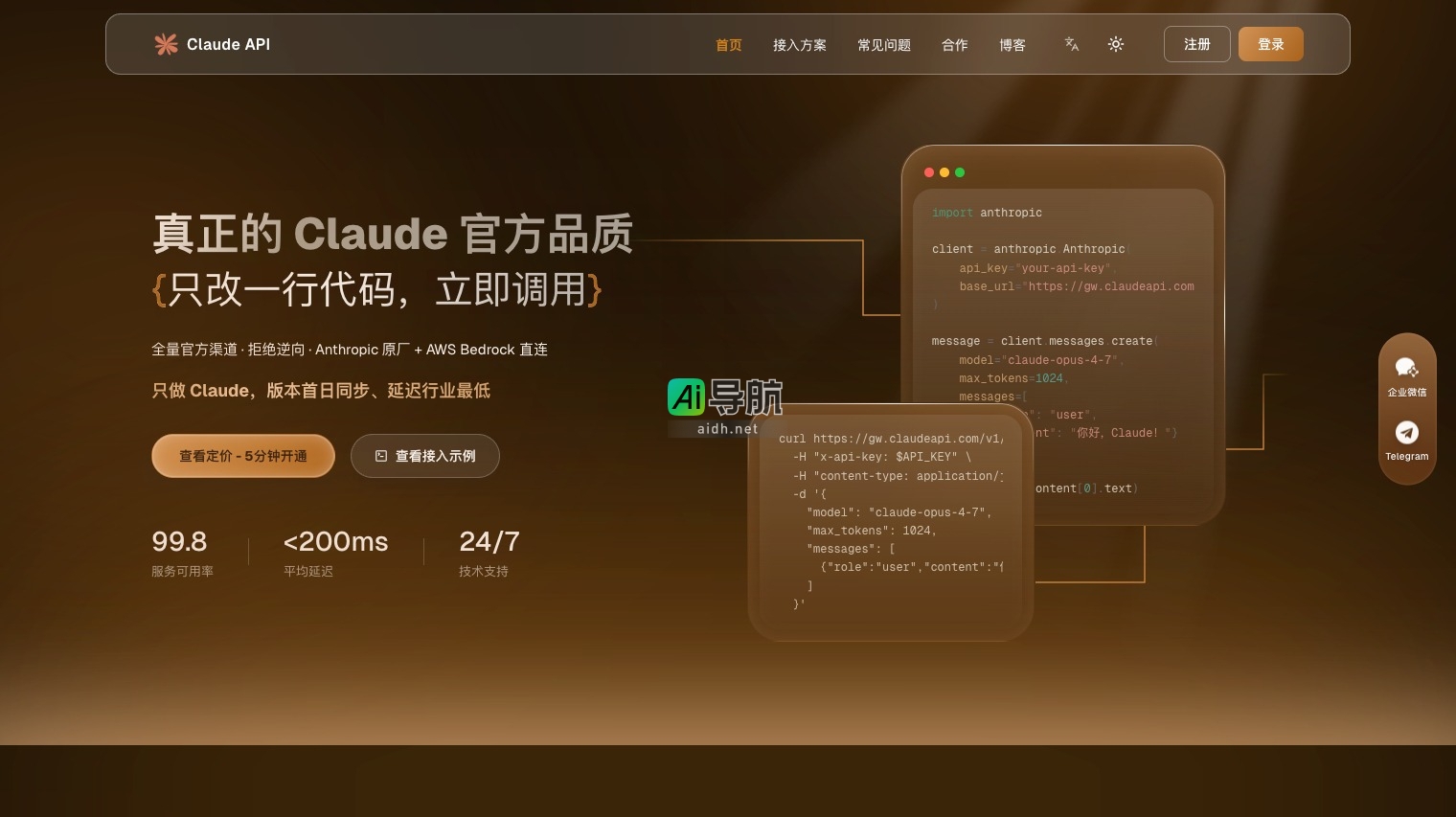 国内直连 Claude API,一键配置立即可用。99.9% 稳定性,低于 200ms 平均延迟,支持 Claude 全系列模型,支付宝/微信充值,24/7 技术支持。