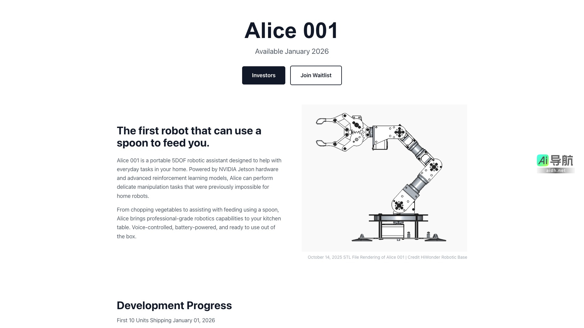 Alice 001 是一款预计于 2026 年 1 月上市的便携式 5DOF 机器人助手,旨在帮助用户完成日常家务。以下是该产品的主要特点和功能: